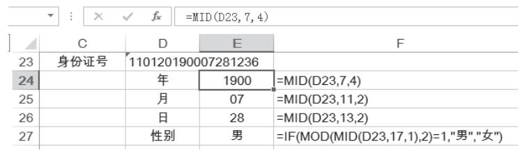 ![]() 在实际工作中我们需要从一些信息中提取出自己需要的字符或文本,说到字符提取,我们就不得不提LEFT、RIGHT 、MID这三个函数了,对于这三个函数你会用吗? 今天我们继续大白话聊Excel系列,来看看这几个函数究竟怎么用。 01 . 基本语法 本文涉及的3个函数,语法内容如下。 从左侧提取: LEFT(text, [num_chars]) 从右侧提取: RIGHT(text,[num_chars]) 从中间提取: MID(text, start_num, num_chars) LEFT、RIGHT、MID三个函数从英文含义上讲依次为左、右、中,也就是分别从左边、右边、中间提取字符。 那么, 提取几个字符呢? 语法中的 num_chars为提取的字符长度,下面使用一个简单的示例来演示。 ![]() 提取字符示例 C10单元格为文本字符串“ExcelHome”,在D10单元格提取C10单元格的左侧5个字符,于是便有公式“=LEFT(C10,5)”,表示的是C10单元格左侧的5个字符。 同理,E10单元格的公式“=RIGHT(C10,4)”,表示的是C10单元格右侧的4个字符。 对于F10单元格,从MID的语法中,看到它的第二参数是start_num,翻译为开始的数字。 也就是说,我们要从中间提取,就要确定一个起始点。就像站队时,老师说:“第3~8位的6位同学出来。” 于是便有公式“=MID(C10,3,6)”,如上图所示。 提取字符的对象,不仅可以是纯文字字符,还可以是数字,如上图的下半部分所示,C12单元格为数字“1234567890”,同样可以使用函数将左、右、中的数字提取出来。 02 . 基本用法 下面熟悉一下这三个函数,这里先不考虑如何“偷懒”,就单纯地使用LEFT、RIGHT、MID函数 在阴影部分区域提取出相应的数字,结果如下图所示。 ![]() 提取字符练习 下面任选几个单元格。 在D17单元格中输入公式: =LEFT(C17,2) 从C17单元格中提取左侧2个字符长度,结果为12。 在F18单元格中输入公式: =RIGHT(C18,5) 从C18单元格中提取右侧5个字符长度,结果为24691。 在E19单元格中输入公式: =MID(C19,5,2) 从C19单元格的第5位字符开始,提取2个字符长度,结果为50。 使用LEFT、RIGHT、MID函数提取的数字都是文本型数字,然而 文本型数字通常没有办法直接用作数字计算。 例如,在上面的练习中,LEFT、RIGHT、MID三个函数将不同部分的数字都提取了出来,如果用这些数字进行计算,写下公式“=SUM(D17:D19)”,得到的结果为0。 要想把文本型数字转化为数值型数字,只需做一次四则混合运算,如“*1”“+0”“/1”“-0”等。 目前比较流行的方法为“减负”,即“--”,把两个减号连写,如“=--LEFT(C17,2)”。 在论坛中,有些帖子讨论过这些用法的差异,有的说用“--”运算效率最高,但经过实际操作发现,上述几个运算符的效率几乎相同,它们最大的区别在于是否“帅气”,同一个按键连按两下即可完成,如果用“*1”的方式,首先要结合【Shift】键并按数字8,然后再找到数字1,相比而言,后者要复杂一些。 03 . 案例操作 下面我们来看看,如何应用这三个函数。 身份证号码中包含了籍贯、生日、性别等信息, 如果想通过身份证号码得到一个人的生日信息,该如何操作呢? 身份证号中的第7~10位表示出生年份,第11~12位表示出生月份,第13~14位表示出生日期。身份证号的第17位表示性别,奇数代表男性,偶数代表女性。 了解了以上信息,就可以使用MID函数将某人出生的年、月、日、性别等信息提取出来。 例如,提取出生年信息的公式为“=MID(D23,7,4)”,如下图所示。 ![]() 提取身份证信息 再如,提取性别信息,我们只要提取身份证号的第17位即可得到标识性别的数字,函数公式为 =MID(D23,17,1) 至于怎样将数字变为男、女,往期讲IF函数时有具体讲解,此处不再赘述。 公式“=MID(D23,17,1)”提取性别,用的是从左向右数,第17位的方式。 如果从右向左数,原第17位数字就成为倒数第2位。那么问题来了,从右向左数时,倒数第n位的数字要怎样提取? 没有特定的函数是提取倒数的, 下面看一下提取字符的第二种方法。 首先厘清思路。如果从右边来看,可以理解为先把右边两位数字提取出来,再在两位数字中提取左边的那1位,最终提取的数字是否为需要的倒数第2位数字呢? 下面来验证一下。在E23单元格中输入公式“=RIGHT(D23,2)”,得到右侧两个字符3和6,如下图所示。 ![]() 提取右侧两个字符 继续在E23单元格中修改公式,将公式改为: =LEFT(RIGHT(D23,2),1) 得到倒数第2位字符3,如下图所示。 ![]() 提取倒数第2位字符 由上述操作可以得出,如果想要提取倒数第n位字符,那就要把右侧n位字符全部提取出来,然后再提取这几位字符中最左边的字符即可。 有人会说,提取性别数字的过程,明明可以只用一个MID函数搞定,为什么要搞得这么复杂呢? 这里讲第二种方法是给大家提供一种 新的Excel函数使用思路,多分析新的思路可以解决函数中的很多问题。 好了,今天的内容就是这些了。 |